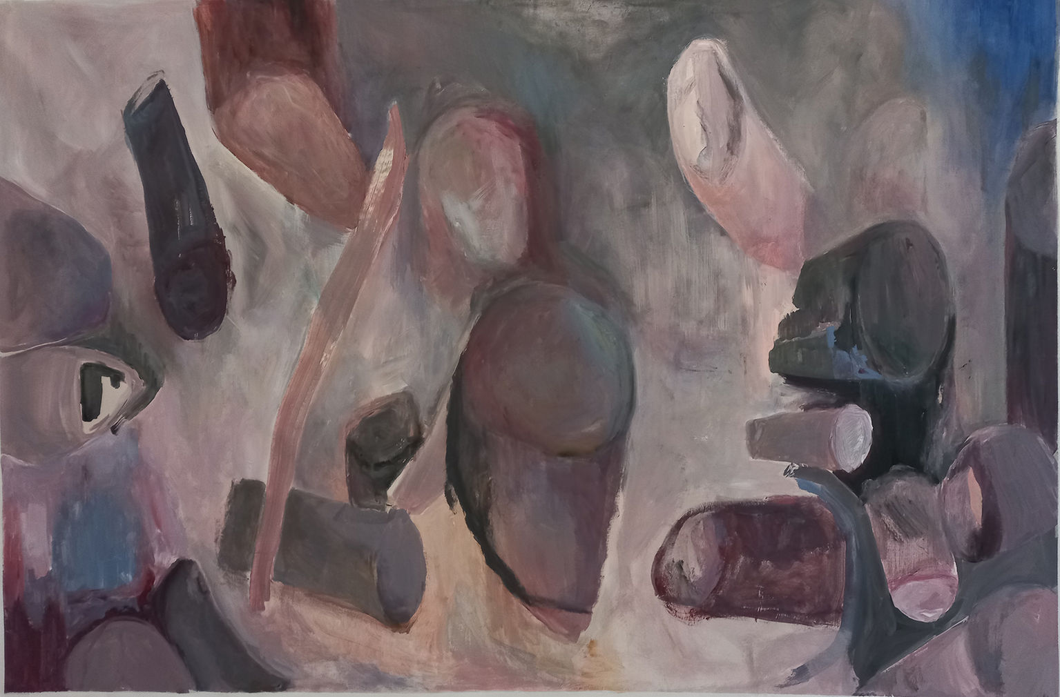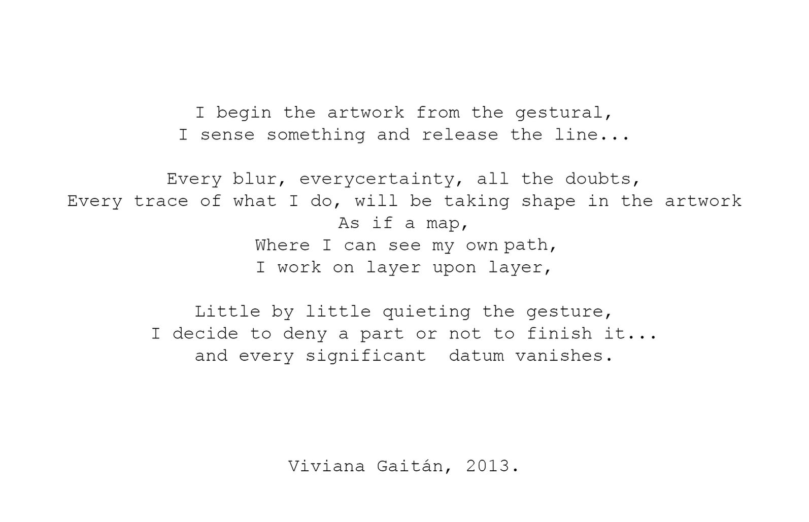 La desprolijidad del gesto descontrolado conscientemente, la paleta restringida y sutil o violenta y contrastante, la presencia de la introspección, el error manifiesto, el pentimento en primer plano, el juego de los opuestos, la abstracción que se impone a una figura que puja por hacerse ver, o a la inversa, desintegrándose en las transparencias, las intensidades que convergen explosivamente generando un nuevo estadio siempre en conflicto como la expresividad misma, la imponente presencia del plano. Viviana Gaitán dice pintar para saber. Y creo que lo mejor que puede tener una obra de arte es generar justamente ese desconocimiento previo que provoca en el espectador –y en el artista mismo- la incertidumbre, el deseo por encontrar cierta comunicación entre él y la obra, la cual no es necesariamente comparte esa misma realidad y su entendimiento no siempre es factible. Y el saber se devela haciendo, o por lo menos se intenta. El artista encuentra haciendo, lo siente, fluye, algo pasa que provoca ese constante hacer y que no se agota en una respuesta o nadie volvería a pintar o esculpir tras su primera obra porque todo estaría respondido. En la obra de Viviana hay poco espacio para delimitar lo que se reconoce de la pura mancha. Sin embargo, todo se combina con sutiles momentos de racionalización que encausan esa pasión expresionista. Las obras tienen conceptos, tienen ideas, tienen fundamentos aun cuando el no-fundamento pareciera ser la regla de oro: esa es otra forma de fundamentar.